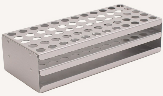 Test Tube racks are an effective way of storing Falcon/ Universal tubes, Bijous, cryogenic vials or any size glass bottles. Racks are available in aluminium and stainless steel with the option of a hand grip. Test Tube racks can be designed to fit in horizontal cold store or be free standing. The standard size holes we offer are; 10, 12, 13, 14, 16, 18, 20, 24, 30mm and other sizes are available on request. Different size test tubes racks are available to suit your requirements. Test tube racks are available in colours such as black, red, gold, blue and purple, labels can be fitted to racks so they can be easily identified.